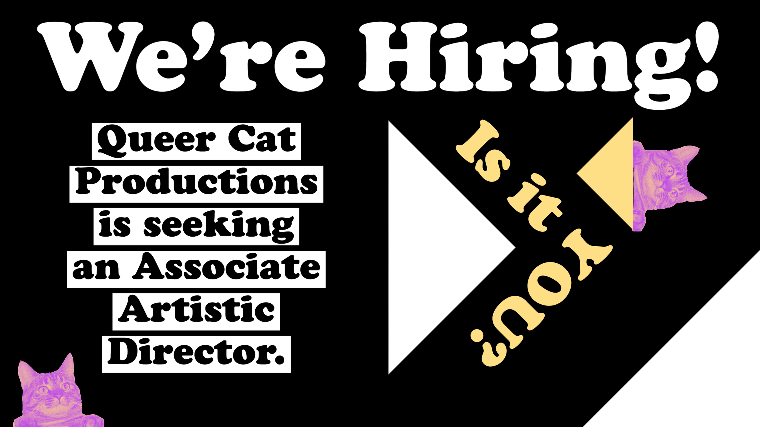 BIG MEWS! Queer Cat Productions is seeking an Associate Artistic Director, 10 hours/week, based anywhere. Application and details, including compensation, PTO, what we’re looking for are here (pdf) and copied below.